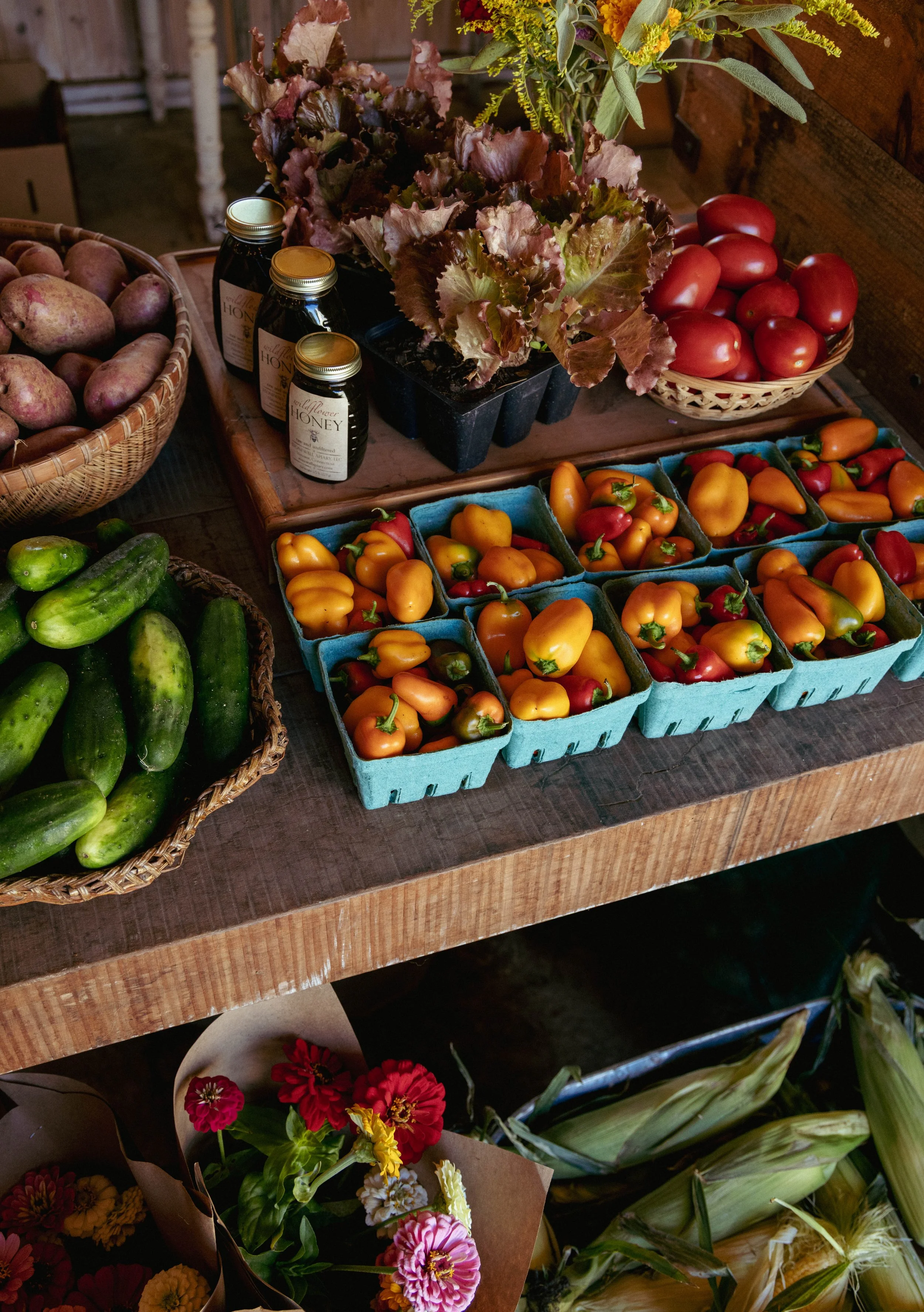 Our fields and gardens yield a rotating variety of vegetables, herbs, and flowers, all grown with care for the land and its biodiversity. At the farm stand, this abundance is shared with the community—fresh harvests alongside local goods—creating a daily connection between the farm and those it nourishes.
